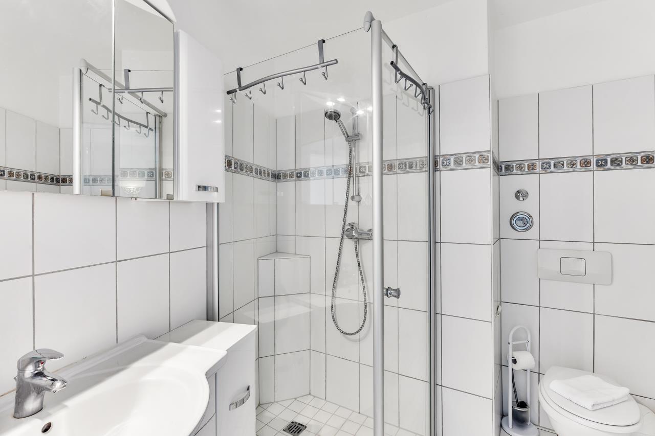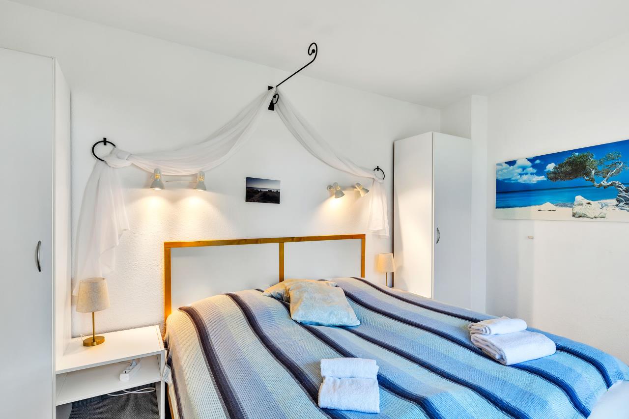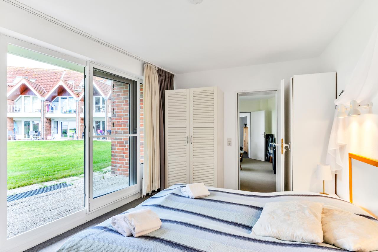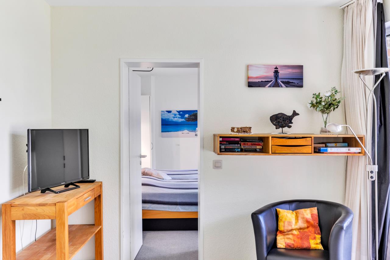 Aus dem Eingangsbereich, der die Wohnungen D5 und D6 verbindet, gelangt man in den das Apartment D5. Direkt an den Flur schließt sich das moderne Duschbad mit bodengleicher Dusche und WC an. An den Flur anschließend befindet sich die Küche mit Eßbereich und einer Terrasse. Das Wohnzimmer ist mit einer Schlafcouch und das Schlafzimmer mit einem Doppelbett ausgestattet. Auch an diesen Räumen schließt eine Terrasse an. An den Terrassentüren des Schlafzimmers wurde Mückenschutz angebracht.