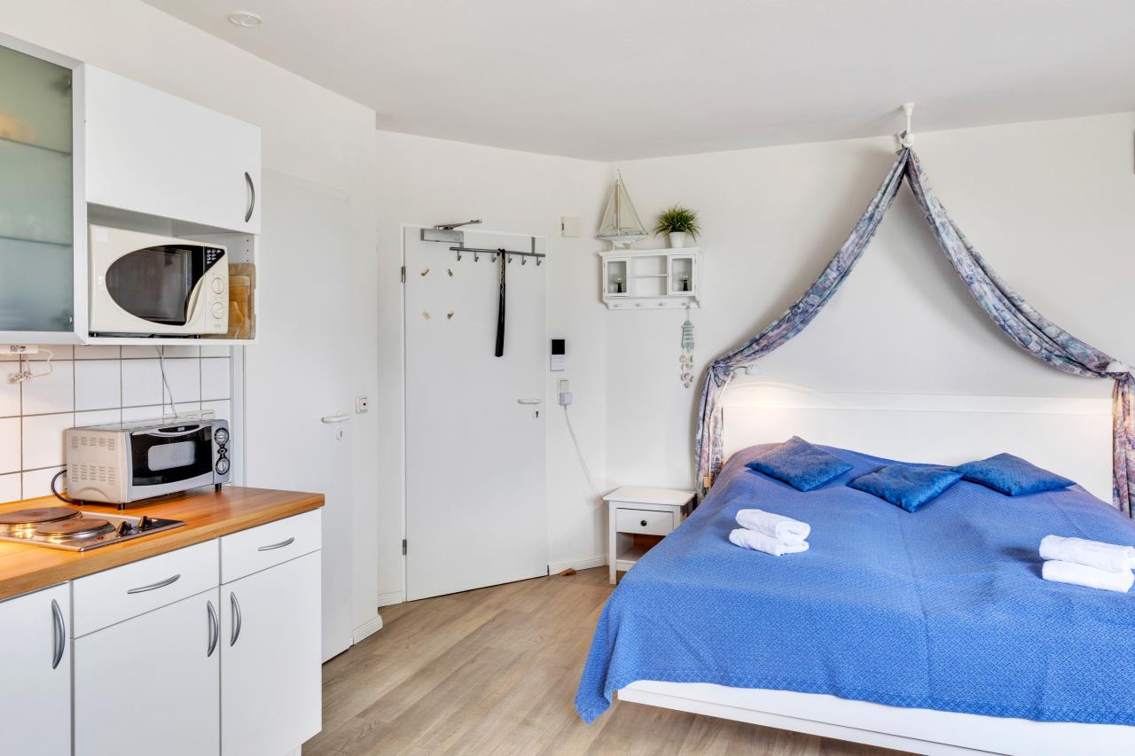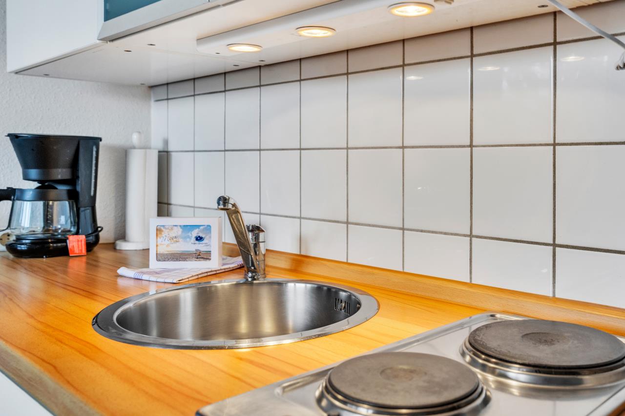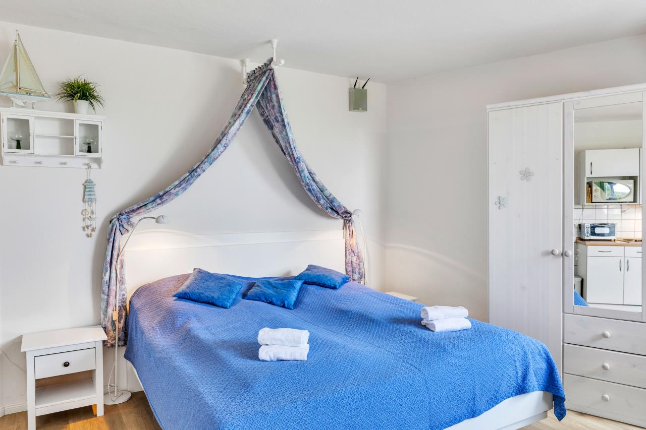 Eine gut ausgestattete Küchenzeile mit Kühlschrank, Minibackofen, Mikrowelle, 2-Plattenherd, Kaffeemaschine, Wasserkocher, Mixer und Toaster befindet sich in dem charmanten Apartment. Eine kleine Sitzgruppe direkt vor den Fenstern mit Blick auf Strand und Meer, ein Doppelbett und Kleiderschrank und ein separates Duschbad bieten eine ideale Übernachtungsmöglichkeit für zwei Personen (evtl. auch mit einem Kleinkind). Ein Babybett und ein Hochstuhl können dazu gestellt werden. Radio, TV und Wlan stehen selbstverständlich zur Verfügung.