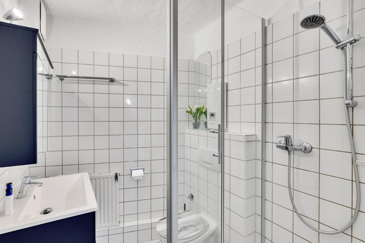 Das moderne Duschbad wurde mit einer Glas-Duschkabine ausgestattet.