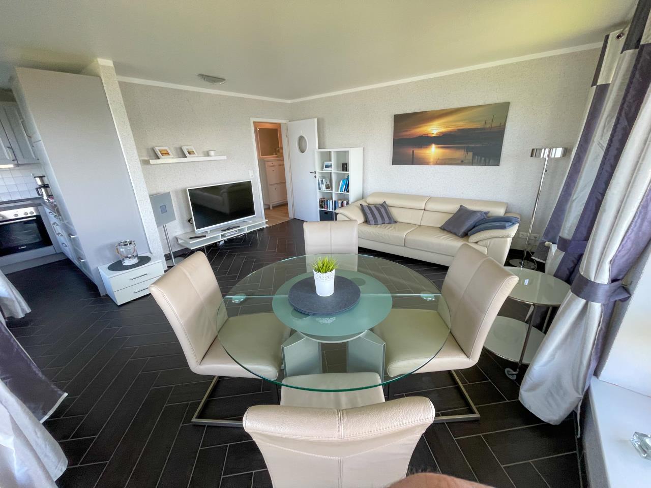 Die erstklassige Wohnung ist in excellentem Zustand und perfekt für zwei Personen geeignet. Wertige Möbel unterstreichen den modernen Charakter dieser Unterkunft. Im lichtdurchfluteten Wohnzimmer entspannen Sie auf dem hellen Ledersofa und lauschen bei geöffneten Fenstern dem leisen Plätschern der Wellen, stöbern bei gemütlichem Licht in einem schönen Buch oder machen sich einen wundervollen Abend vor dem Flachbildfernseher. Der offene gut ausgestattete Wohn- und Essbereich lädt stets zum kochen ein, um leckere Gerichte vorzubereiten und diese zu genießen.